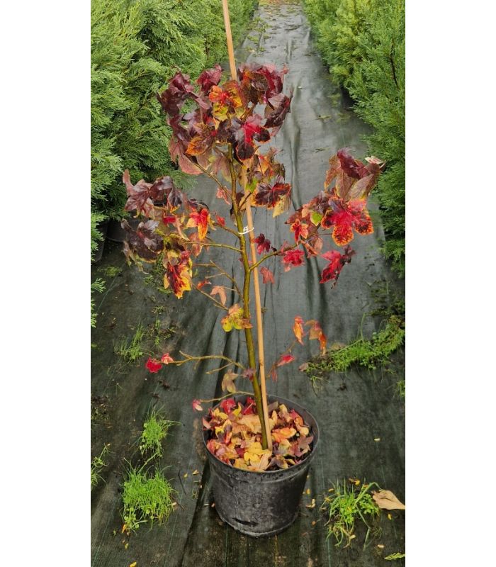 Le LIQUIDAMBAR stryraciflua ou COPALME D' AMERIQUE est un arbre caduc à croissance rapide, au port pyramidal d'une hauteur adulte de 20 m x 6 m, avec une magnifique coloration automnale, mélange de jaune, de rouge ou de violet, qui lui vaut un grand succès. Ses branches sont horizontalement étalées et ses feuilles d'une dizaine de cm sont de couleur verte.